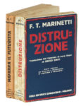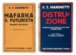 In-16° (mm 186x118). Pagine 298, [6]. Alcune carte in principio allentate, per il resto perfetto stato. Brossura editoriale originale arancione con titoli impressi in nero a piatti e dorso. Timbro di precedente proprietario alla carta di occhietto. SI AGGIUNGE: Id., Distruzione. Poema futurista. Nuova edizione col Processo e l'Assoluzione di Mafarka il futurista. Milano: casa editrice Sonzogno, s.d. In-16° (mm 185x118). Brossura editoriale originale impressa in blu e rosso. Titolo a dorso e piatti. Macchiato il dorso, minime mancanze alla cuffia inferiore. (2)