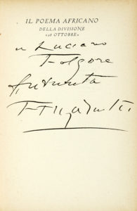 Marinetti Filippo Tommaso, Dedica autografa su libro Poema africano della Divisione 28 Ottobre. Milano: Mondadori, 1937.
