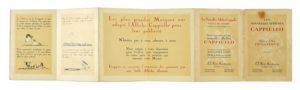 Pieghevole a 6 ante (mm 160x100 - aperto, mm 630x100) contenente 6 litografie originali a colori su un lato, nell'altro testo impresso a due colori su fondo decorato. Minime mancanze in corrispondenza delle pieghe, una scuritura alla prima carta (che non tocca tavole o testo) per il resto ottimo stato. (1)