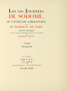 Sade Donatien Alphonse François, Les 120 journées de Sodome ou L'école du libertinage [...]. Edition critique, établie sur le manuscrit original autographe par Maurice Heine. Tome premier (-troisième). A Paris: par S[tendhal]. & C[ompagnie],...