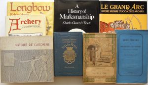 Intérieur en très bon état. • CHENEVIX TRENCH (Charles). A History of Markmans- hip. Longman, 1972. Petit in-4, reliure éditeur, jaquette illustrée. 317 pp. Illustrations en noir et en couleurs. Très bon état. • DEPPING (Guillaume). Merveilles de la Force et de l'Adresse. Paris, Hachette, 1878. In-12, cartonnage éditeur percaline bleue. Fer doré (Prix Municipal) sur le plat. 376 pp. Figures dans le texte. Bon état. • HARDY (Robert). Le grand Arc. Histoire militaire et sociale des Archers. Paris, Edita - Denoël, 1977. Petit in-4, reliure éditeur, jaquette illustrée. 206 pp. Illustrations en noir et en couleurs. Très bon état. • HARDY (Robert). Longbow. A social and military history. Cambridge, Stephens, 1976. Petit in-4, reliure éditeur, jaquette illustrée (traces de scotch sur le rhodoïd). 216 pp. Illustrations en noir et en couleurs. Très bon état. Même ouvrage en anglais que ci-dessus. • HEATH (E.G.). Archery. A Military History. London, Osprey, 1980. In-8, reliure éditeur. Jaquette illustrée. 224 pp. Illustrations en noir dans le texte. • LAPLANE (H. de). Les Arbalétriers, les Arquebusiers et les Archers. Leurs services à Saint-Omer et les environs. Saint-Omer, Fleury-Lemaire, s. d. Plaquette in-8, brochée. 16 pp. Tiré à part du Bulletin de la Société des Antiquaires de la Morinie. • ROTH (Robert). Histoire de l'Archerie. Dessins de l'auteur. Paris, Cupillard, 1964. In-8 carré, cartonnage éditeur illustré (rousseurs). 156 pp. Illustrations dans le texte et à pleine page.