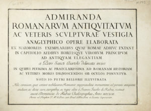 Bartoli Pietro Santi, Admiranda Romanarum antiquitatum ac veteris sculpturae vestigia anaglyphico opere elaborata [...] notis Io. Petri Bellorii illustrata... Romae: typis edita à Joanne Jacobo de Rubeis, restituit auxit Dominicus de Rubeis, 1693.