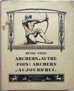 Stein (Henri). Archers d’autre- fois, Archers d'aujourd'hui. 20 illustra- tions hors texte en phototypie, 110 illustrations par Léon Laugier dans le texte. Paris, Longuet, 1925. In-4, broché. Couverture illustrée (trois petites taches brunes)....