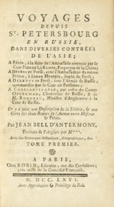 Bell John, Voyages depuis St Petersbourg en Russie, dans diverses contrées de l'Asie [...]. Tome premier (-troisiéme). A Paris: Chez Robin, 1766.