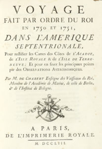 Chabert Joseph Bernard, Voyage fait par ordre du roi en 1750 et 1751, dans l'Amérique septentrionale, pour rectifier les cartes des côtes de l'Arcadie, de l'Isle Royale & de l'Isle de Terreneuve. A Paris: de l'Imprimerie royale, 1753.