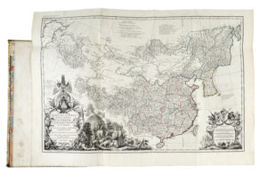 4 volumi in folio (mm 432x275). Pagine [4], VIII, LII, III, [1], 592 [i.e. 590] + 25 carte geografiche più volte ripiegate o a doppia pagina; [4], IV, 725, [1] + 10 carte di tavole a piena e doppia pagina; [4], IV, 564, [3], 1 bianca + 5 carte di tavole; [4], II, 520 [i.e. 518] + 25 carte geografiche più volte ripiegate. Con nel complesso 65 tavole incise in rame fuori testo, con mappe, vedute e raffigurazioni di costumi e riti religiosi cinesi. Frontespizi in inchiostro rosso e nero con vignetta calcografica, testatine incise sia in rame che in legno, capilettera e finalini xilografici. Al primo e al terzo volume volue gora d'acqua nel margine inferiore degli ultimi fascicoli, fioriture sparse, alcune carte lievemente e uniformemente brunite, sporadiche macchie, nel complesso buona copia. Legatura coeva in pieno vitello con titoli e decorazioni in oro ai comparti del dorso, tagli spruzzati in rosso, sguardie marmorizzate. Alcune mancanze lungo le cerniere e in corrispondenza dei dorsi. Ex-libris di precedente proprietario al contropiatto anteriore, nota di possesso manoscritta sul frontespizio di ciascun volume. (4)
