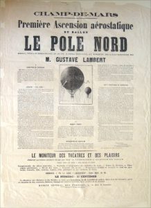 [Aérostat]. Lambert (Gustave). Première Ascension Aérostatique du Ballon Le Pöle Nord executée le dimanche 27 juin, au profit de l'expédition de M. Gustave Lambert. Paris, Imp. Vallée, s. d. (1869). Placard (62,5 x 46 cm) illustré d'une...