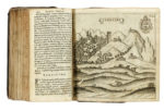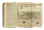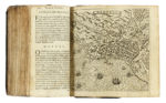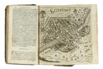 3 parti in 1 volume in-12° (mm 133x75). Pagine [24], 706 [i.e. 704], 2 bianche con 35 [di 37] tavole ripiegate fuori testo, ciascuna raffigurante una diversa città italiana. Ciascuna parte con proprio frontespizio con incisione in legno. Copia con difetti; assente la carta di testo G11, piccoli lavori di tarlo marginale nella prima parte del volume, più consistenti nel margine interno della terza parte (talvolta con perdita di alcune lettere di testo e piccole porzioni di inciso), occasionali macchie e gore. Legatura coeva in piena pelle con titolo impresso in oro al dorso. Mancanze lungo cerniere e dorso. (1)