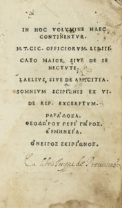 Cicero Marcus Tullius, In hoc volumine haec continentur. [...] Lib. III Cato maior, siue De senectute... (Al colophon:) Impressum Venetiis: per Melchiorem Sessam, & Petrum de Rauanis socios, 1523 Die XIX Martii.