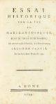 In-8° (mm 178x105). Pagine 88. Carte uniformemente arrossate e altri piccoli marginali difetti. LEGATO CON: Essai Historique sur la vie de Marie-Antoinette [...] seconde partie... A Rome: [s. e.], 1789. Pagine 102, [2]. Fioriture sparse. Alcuni fascicoli allentati. Legatura in mezza pelle con punte e piatti in carta marmorizzata. Titoli e fregi in oro su tassello in pelle al dorso. Tagli spruzzati in rosso. Rottura al margine superiore del piatto anteriore. (1)