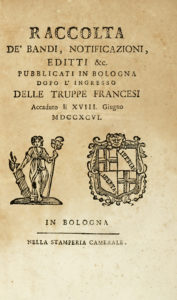 Raccolta de' bandi, notificazioni, editti & c. pubblicati in Bologna dopo l'ingresso delle truppe francesi. Parte prima (-decimanona). In Bologna: nella stamperia Camerale, 1796-1797.