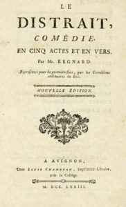 In-8° (mm 193x120). Pagine 27, [1]. Piccolo fregio al frontespizio e testatine in legno. Un piccolo strappo marginale senza perdite, altrimenti buona copia. Legatura in cartonato decorato, con titoli manoscritti su tassello al dorso. Qualche difetto al dorso e punte stanche. PRECEDUTO DA: Regnard Jean François, Le distrait, comédie en cinq actes et en vers [...]. Nouvelle édition. A Avignon: chez Louis Chambeau, 1773. In-8° (mm 193x120). Pagine 71, [1]. Fregio al frontespizio e testatina in legno. UNITO CON: Beaumarchais Pierre Auguste Caron De, Les deux amis, ou Le negociant de Lyon, drame en prose et en cinq actes... A Avignon: chez Louis Chambeau, 1772. In-8° (mm 193x120). Pagine 76. Fregio al frontespizio e testatina in legno. Due strappetti maldestramenti restaurati al frontespizio, con macchie e fioriture; parzialmente staccata la carta B1 e uno strappo con grave perdita di inciso alla carta K2. Lievi bruniture ad alcune carte, macchioline e qualche forellino di tarlo. SEGUITO DA: Guichard Jean-François, Le bucheron, ou Les trois souhaits. Comédie en un acte, mêlée d'ariettes. Représentée pour la premiere fois par les comédiens italiens ordinaires du Roi, le lundì 28 février 1763. A Paris: chez la veuve Duchesne, 1768. In-8° (mm 193x120). Pagine 38, [2]. Fregio al frontespizio e testatina in legno. Rare bruniture e uno strappo senza perdite alla carta E4,ma nel complesso buono stato di conservazione. (1)