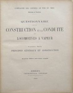 Herdner (A.). Questionnaire sur la Construction et la Conduite des Locomotives à Vapeur. 1. Principes généraux et construction. 2e éd. entièrement refondue. Bordeaux, Delmas imp., 1916. In-4, reliure demi-chagrin vert, dos à 5 nerfs. Petits...