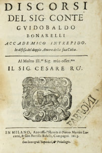Bonarelli Guidubaldo, Discorsi [...] in difesa del doppio amore della sua Celia. In Milano: appresso l'herede di Pietro Martire Locarni, & Gio. Battista Bidelli, 1613.