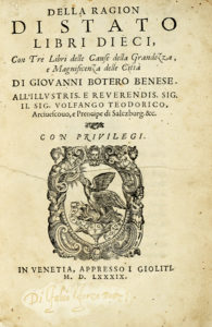 Botero Giovanni, Della ragion di stato libri dieci, con tre libri delle cause della grandezza, e magnificenza delle città... In Venetia: appresso i Gioliti, 1589.