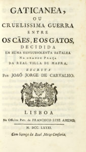 Carvalho Joao Jorge (de), Gaticanea, ou Cruelissima guerra entre os cães, e os gatos, decidida em huma sanguinolenta batalha na grande Praça da real villa de Mafra. Lisboa: na officina patr. de Francisco Luiz Ameno, 1781.
