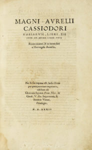 Cassiodorus Flavius Magnus Aurelius, Variarum Libri XII. Item de anima liber unus. Recens inventi, & in lucem dati a Mariangelo Accursio. 1533 (Al colophon:) Augustae. Vindelic.: ex. aedibus Henrici. Silicei, mense Maio 1533.