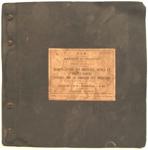 P. L. M. Matériel et Traction. Nomenclature des Matières, Pièces et Objets divers fournis par la Division des Magasins. 1934. In-folio carré, riveté. Plats cartonnés noirs, étiquettes imprimées au dos et sur le plat (défraìchies). Rare...