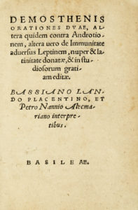 Demosthenes, Orationes duae, altera quidem contra Androtionem, altera uero de immunitate aduersus Leptinem... Basileae: s.e., s.l. (Al colophon:) Basileae: ex officina Ioannis Oporini, 1544, mense aprili.