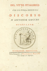 4 volumi in-8° (mm 190x120). Legatura successiva in mezza pelle con punte e piatti in carta decorata. Titoli in oro al dorso. SI AGGIUNGE: Cocchi Antonio, Del vitto pitagorico per uso della medicina. In Firenze: nella stamperia di Francesco Moucke, 1743. (5)
