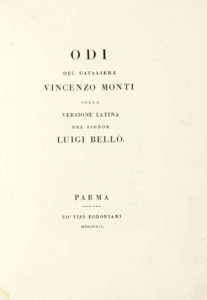 In folio (mm 312x230). Pagine [8], 5, 1 bianca, [2]. carte [9] contenenti 8 componimenti numerati I-VIII e 8 tavole a piena pagina fuori testo. Fregio calcografico al frontespizio. Alcune fioriture marginali, gora nelle ultime carte. Brossura originale in cartonato albicocca con macchie e mancanze.SI AGGIUNGE: Monti Vincenzo, Odi [...] colla versione latina del signor Luigi Bellò. Parma: co' Tipi Bodoniani, 1812. In-4° (mm 223x160). Pagine [12], 73, 3 bianche. Esemplare perfettamente conservato, in barbe e parzialmente intonso, con solo una piccola gora nel margine interno delle prime carte. Brossura originale in cartonato albicocca. (2)