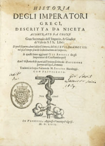 Nicetas Acominatus, Historia degli imperatori greci [...] in XIX libri: li quali seguono, dove lascia il Zonara, dal 1117 fino al 1203 nel qual tempo si vede la declinatione del imperio [...]. Tradotti in Lingua Italiana da M. Ioseppe Horologgi. In...