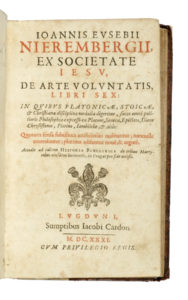 Nieremberg Juan Eusebio, De arte voluntatis, libri sex: in quibus platonicae, stoicae, & christianae disciplinae medulla digeritur... Lugduni: sumptibus Iacobi Cardon, 1631.