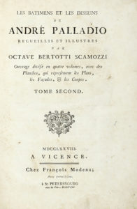 Palladio Andrea, Le batimens et les desseins [...] recueillis et illustrés par Octave Bertotti Scamozzi. Tome 2 (-4). In Vicence: chez Francois Modena, 1776-83.