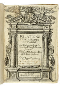 Pigafetta Filippo, Relatione dell'assedio di Parigi. In Roma: appresso Bartolomeo Grassi. (Al colophon:) In Roma: appresso Iacomo Ruffinello, 1591.