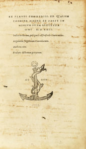 Plautus Titus Maccius, Comoediis XX quarum carmina magna ex parte in mensum suum restituta sunt 1522... (Al colophon:) Venetiis: in aedibus Aldi, et Andreae Asulani Soceri, mense iulio, 1522.