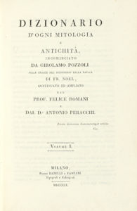 Pozzoli Girolamo, Dizionario d'ogni mitologia e antichità... Milano: presso Batelli e Fanfani tipografi e calcografi, 1809 [i.e. 1819]-1827.