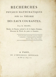 Prony Prony Gaspard Clair Francois Marie Riche de, Recherches physico-mathématiques sur la théorie des eaux courantes. A Paris: de l'imprimerie impériale, an XII 1804.