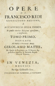 Redi Francesco, Opere... Tomo primo (-settimo). In Venezia: per Gio. Gabbriello Ertz, 1712-1730 (1742-60).