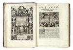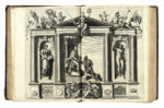 3 parti in 1 volume in-4° (mm 263x193). Pagine [20], colonne 1-8, pagine 136, colonne 137-144, pagine 344, colonne 345-352, pagine [4], 353-398, [18], 401-566, [2] con 2 tavole a doppia pagina fuori testo. Ciascuna parte con proprio frontespizio inciso, 5 tavole a doppia pagina (di cui 3 nel testo e 2 fuori testo), moltissime calcografie con emblemi impresse a mezza e piena pagina nel testo, inclusi emblemi di re, regine e imperatori. Copia con tracce d'uso al frontespizio, leggere gore d'acqua marginali alle prime e alle ultime carte, sporadiche fioriture, lievemente rifilata nel margine superiore, ma per il resto completa, internamente in ottimo stato e marginosa. Legatura successiva in piena pelle con titolo impresso in oro su tassello al dorso e decorazioni dorate ai comparti. Mancanze lungo cerniere e dorso, unghiature lise. (1)