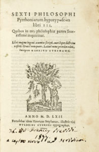 Sextus Empiricus, Pyrrhoniarum hypotyposeon libri III... S.l. [i.e. Ginevra]: excudebat idem Henricus Stephanus, 1562.