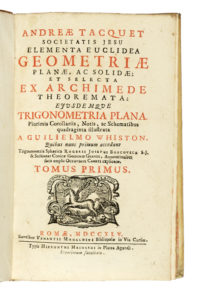 Tacquet André, Elementa Euclidea geometriae planae, ac solidae... Tomus primus (- secundus). Romae: sumptibus Venantii Monaldini bibliopolae [...] typis Hieronymi Mainardi, 1745.