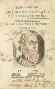 2 parti in 1 volume in-4° (mm 200x150). Carte [10], 118; 29 [i.e. 32]. Ciascuna parte con proprio frontespizio con fregio xilografico. Macchie al frontespizio, tracce d'uso passim, copia leggermente corta di margini. Legatura moderna in pieno cartonato con tassello originale riapplicato al dorso. Sguardie rinnovate. SI AGGIUNGE: Id., Le sette giornate del mondo creato... In Viterbo: appresso Girolamo Discepolo, 1607. In-8° (mm 160x105). Pagine [12], 322, [2]. Ritratto dell'Autore sul frontespizio. Frontespizio controfondato, con alcune mancanze nell'inciso, ultima carta con difetti. Copia gorata. Legatura in pergamena antica rimontata con titolo manoscritto al dorso. Restauri a dorso e punte. Note di possesso manoscritte a frontespizio e ultima carta. (2)