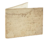 In-4° oblungo (mm 195x247). Carte [1], 16, [2] bianche. Ampia gora al margine superiore di tutto il volume e fioriture diffuse; annotazione al verso di tutte le carte. Legatura coeva in pieno cartonato muto, con numerose annotazioni manoscritte e ampie gore ai piatti. (1)