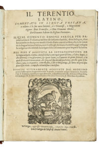 Terentius Afer Publius, Il Terentio latino, comentato in lingua toscana, e ridotto à la sua vera latinità [...] da Giovanni Fabrini da Fighine fiorentino. In Vinegia: appresso Giovambattista, e Marchio Sessa fratelli, s.d. (Al colophon:) In...