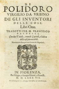 Virgilio Polidoro, De gli inventori delle cose libri otto [...] tradotti per M. Francesco Baldelli. In Fiorenza: Per Filippo, e Iacopo Giunti, e fratelli, 1587.
