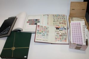 3 albums de timbres, 2 boites de vrac, un classeur et un album vide