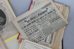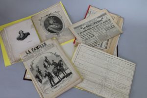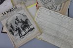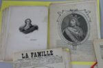 Lot de vieux papiers: Chemise A 31 Gravures anciennes de célébrités Chemise B 23 pages de garde du journal : « LA FAMILLE » de 1880 Chemise C Feuilles de journaux anciens dont : - L'Action républicaine du 23/03/1938 - Du Figaro du 08/08/1945 (réédition ?) - Le populaire d'Eure et Loir du 19/07/1946 - Réédition des premières de - Le Petit Parisien du 22/05/1940 - Le Petit Parisien du 09/06/1940 - Du Progrès du 24/06/1940 - Du Parisien libéré du 22/08/1944 Chemise D 23/04/1875 Reconstitution, des actes de l'état civil de Paris : naissance et mariage de Mr Jean CHAPLIN 1908 3 feuillets de la ville de DREUX concernant les naissances ? nourrices ??? enfants assistés ??? ? Plan des environs de Paris proposé par le BON MARCHE