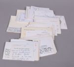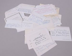 Ensemble de plus de 300 cartes de visite adressées à Monsieur Gaston Palewski, président du Conseil Constitutionnel ou à Monsieur et Madame Gaston Palewski, en réponse à des invitations. On trouve de nombreuses personnalités de la plitique, des arts, de la société comme Pierre-Eugène CLAIRIN, Jacques CHASTENET, P. M. G. LE CLEZIO, Michel LEIRIS, Jean-Pierre RAMPAL, Maurice GENEVOIX, André CHASTEL, Yves BRAYER, Gerald Van Der KEMP, etc