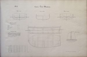 d'étiquette sur le plat, liens d'attache manquants en pied. Titre (à l'horizontale) et 12 ff. de texte sur deux colonnes en hauteur, certains recto-verso, et 60 planches. Qq. rousseurs sur certaines planches, petites déchirures et salissures en marges latérale et inférieure d'une planche partiellement détachée. Ouvrage entièrement lithographié par Ed. Robert « sourd-muet, imprimeur-lithographe rue de la Monnaie n° 11 », composé de dix livraisons de six planches. La planche n° 16 est une Table des proportions principales de tous les Bâtimens les plus en usage au Commerce, les autres représentent des plans de bateaux qui, selon leur auteur, « sont tracés avec tant de simplicité qu'un Ouvrier intelligent pourra les exécuter en consultant les échelles qui sont de la plus minutieuse exactitude». Les commentaires sur les planches sont dus à Jean Le Bot, professeur à l'Université de Rennes. Rare édition originale. Polak 10896 bis.