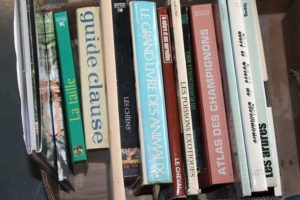 Carton contenant 14 livres sur les thèmes : animal, plantes, arbres et champignons