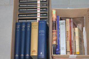 2 Cartons contenant divers volumes dont Histoire Universelle de l'Art en 5 volumes, WOLFRAM VON SODEN Akkadisches Handworterbuch: 3 volumes, Le Musée des offices et le palais Pitti, L'encyclopédie des vins et des alcools, GEO PANORAMIQUE intitulé Patrimoine d'exception, La Cité Interdite au Louvre, TURNER La vie et les chefs-d'oeuvre , l'Architecture de la renaissance...