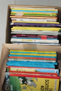 2 cartons contenant 46 bandes dessinées diverses dont Les Schtroumpfs, Yakari, Spirou...