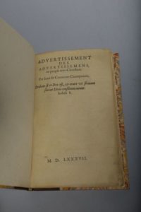 CAUMONT (Jean de) : Advertissement des advertissements, au peuple très-chrestien. Par Iean de Caumont, Champenois. S. l. (Lyon), [Jean Pillehotte], 1587 ; petit in 8°, 25 pp., demi-basane brune, dos lisse, titre frappé en long, décor de filets dorés et fleuron estampé. Reliure moderne. L'auteur, Jean de Caumont, né à Langres, ardent catholique ligueur, mourut empoisonné la même année 1587. Première édition extrêmement rare Baudrier, II, 275/8, attribue cette première éd. À Jean Pillehotte) ; Cioranescu, XVI, 6006.