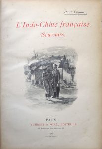 Doumer (Paul). L’Indo-Chine Française. (Souvenirs). Paris, Vuibert et Noury, 1905. Grand in-8, reliure éditeur demi-toile beige à coins, dos muet, plat illustré. Plat un peu défraìchi. Couverture conservée (illustrée) mais pas titre....