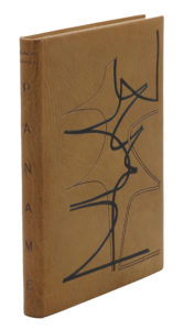 Paris, Henri Jonquières & Cie, 1927. In-8, maroquin havane, premier plat orné d'une composition abstraite de listels de maroquin noir et de filets à froid, dos lisse avec titre à froid, doublure et gardes de même maroquin, tête dorée, chemise et étui (Paule Ameline).Édition illustrée d’un frontispice gravé à l’eau-forte et de 23 compositions en noir, dont 7 à pleine page de Jean Oberlé.
